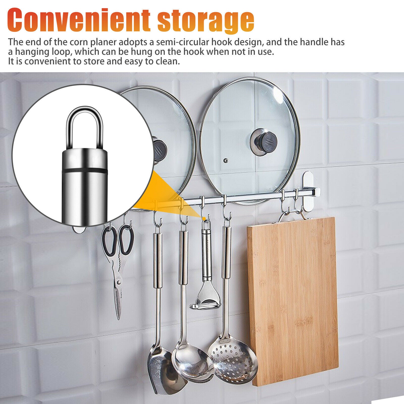 - Convenient storage: The end of the corn planer adopts a semi-circular hook design. and the handle has a hanging loop. which can be hung on the hook when not in use. It is convenient to store and easy to clean.